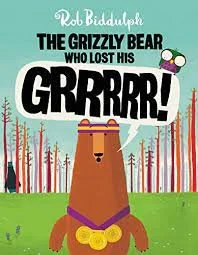 Image of a cartoon brown bear on a blue background proudly wearing a purple ribbon with 3 medals hanging from it. The image reads “Rob Biddulph The Grizzly Bear Who Lost HIs GRRRRR!”